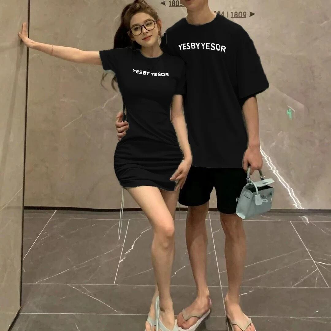 男性はオーバーサイズTシャツ、女性はフィット感のあるミニ丈ワンピースタイプで、ペアでもそれぞれのシルエットが映えるデザイン。