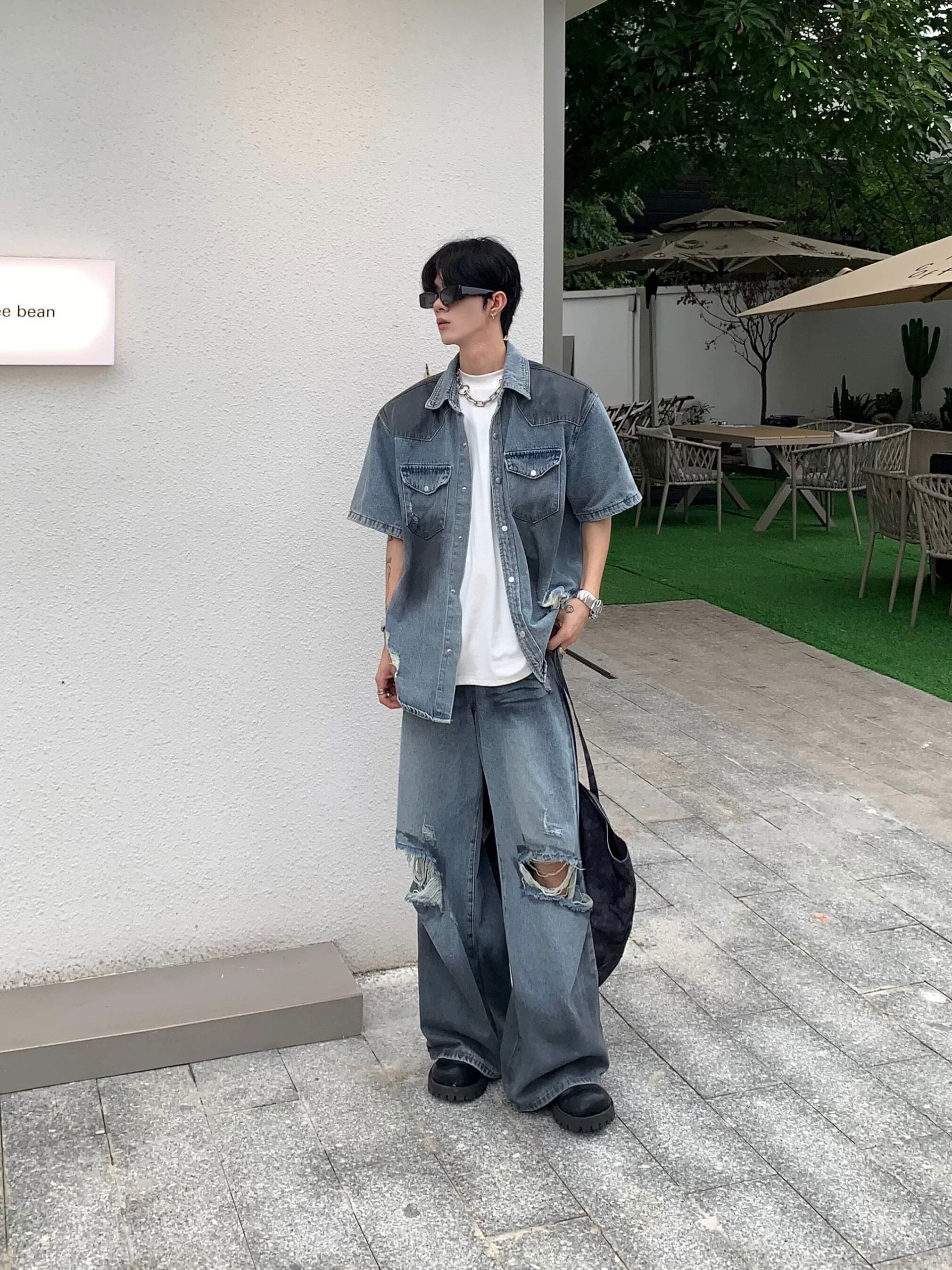 【S3-t】ヴィンテージウォッシュ デニムシャツ 上下セット可|UNISEX対応|ヴィンテージ加工 × ワイドシルエット|韓国ストリート系